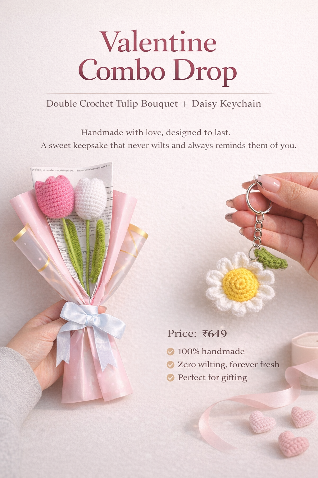 This Valentine combo is a perfect blend of charm and craftsmanship. Each piece is carefully handmade with premium yarn, designed to stay beautiful forever — just like your love. Whether it’s for Valentine’s Day, an anniversary, or a surprise “just because” gift, this combo is made to leave a lasting impression.